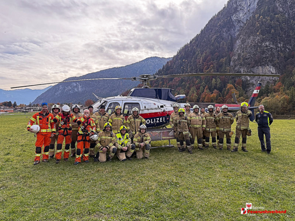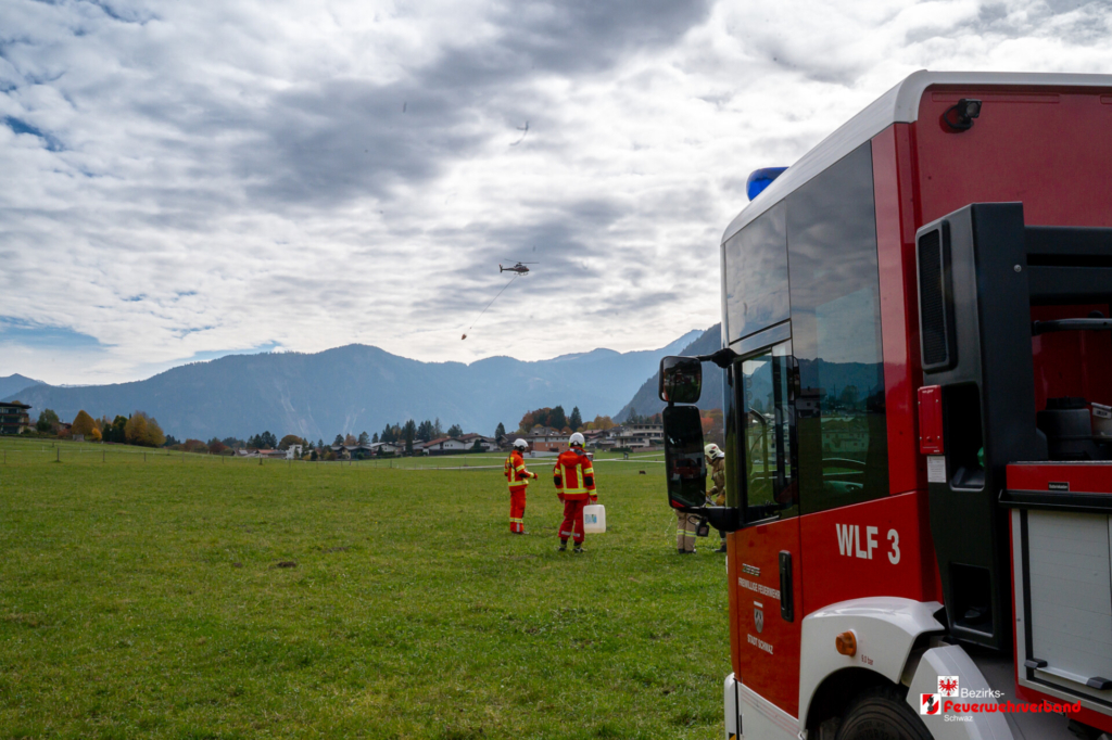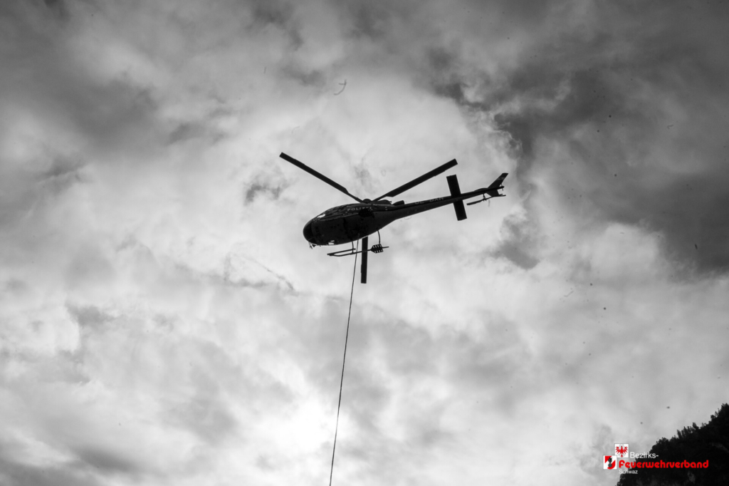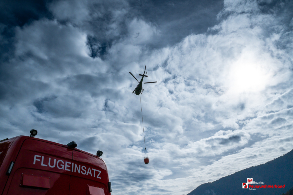 Schnell war ein passender Platz gefunden, dieser wurde eingerichtet und für den Hubschrauberbetrieb abgesichert. Zwei Flughelfer der Freiwilligen Feuerwehr Schwaz wurden direkt beim Gerätehaus Schwaz aufgenommen und führten sofort einen Erkundungsflug über das Einsatzgebiet durch.