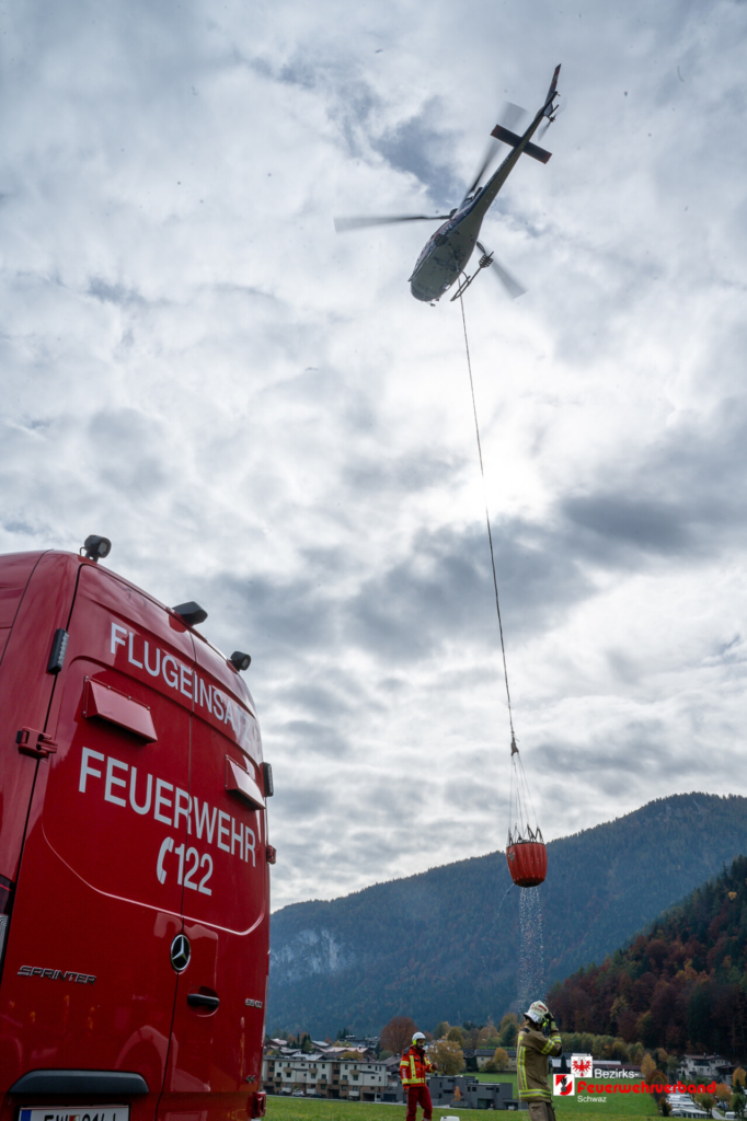 Währenddessen bereiteten die Einsatzkräfte am Landeplatz Schanzwerkzeug, Löschrucksäcke, Motorsägen und weiteres Gerät vor. Auch eine Löschwasserleitung wurde von der Freiwilligen Feuerwehr Eben aufgebaut, um das Bambi Bucket – Löschbehälter für den Flugeinsatz befüllen zu können.