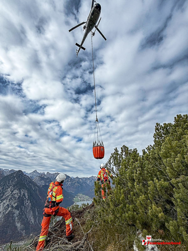 Die Libelle Tirol flog vier Mann der FF Wiesing in das Einsatzgebiet auf den Berg, um die Flughelfer bei den Löscharbeiten zu unterstützen. Vor Ort wurden die betroffenen Flächen umgegraben, Latschen entfernt und der Bereich mittels insgesamt zehn Wassertransportflügen vollständig abgelöscht.