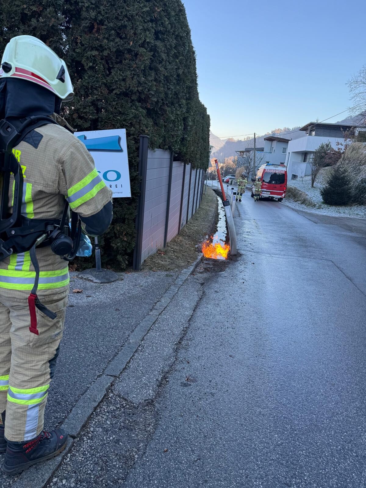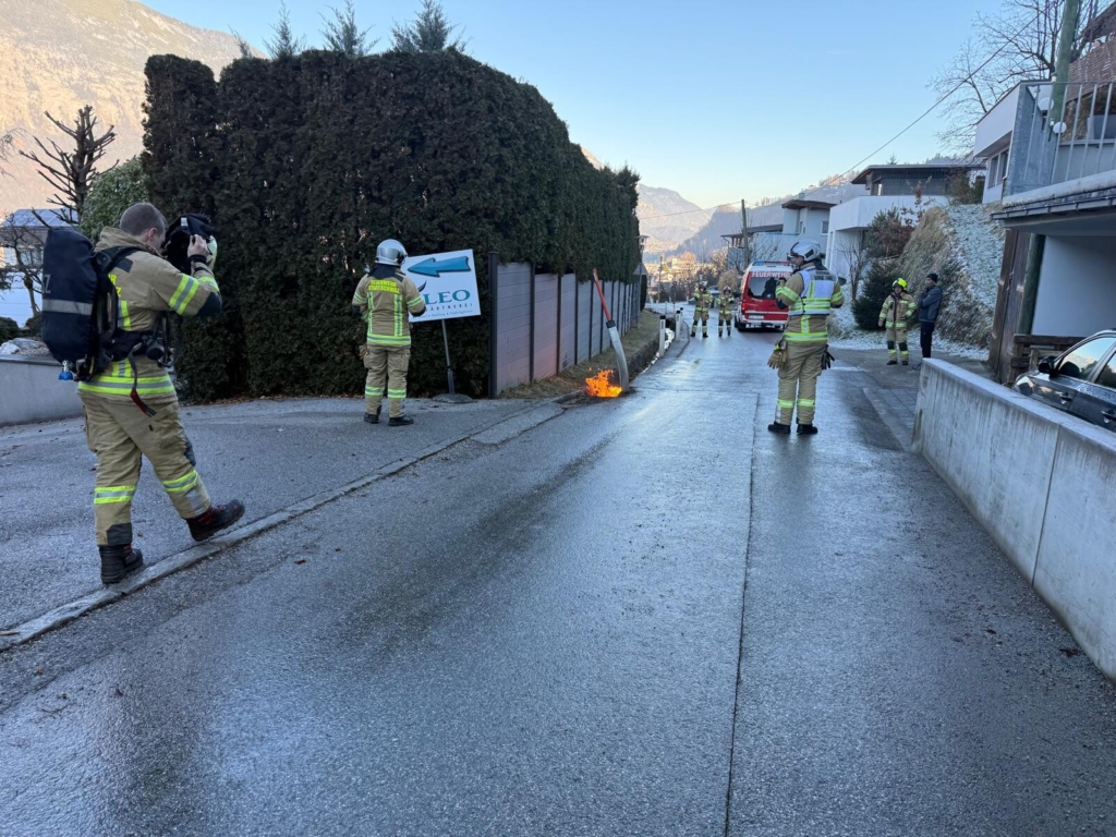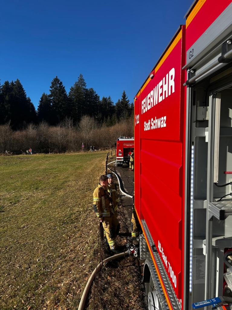 Zwischenzeitlich kam es noch zu einem weiteren Brandeinsatz: Bei der Inbetriebnahme eines Heizstrahlers entzündete sich eine Gasflasche. Geistesgegenwärtig wurde die brennende Flasche in einen angrenzenden Bach gelegt. Unsere Aufgabe bestand darin, einen Absperrkreis um die Gasflasche einzurichten, diese zu kühlen und anschließend abzudrehen. Dank des besonnenen Handelns und des schnellen Einsatzes der Feuerwehr wurde niemand verletzt.