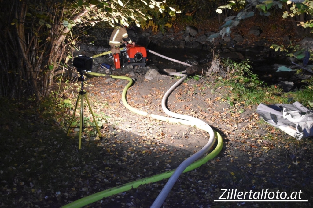 Währenddessen bereiteten die Einsatzkräfte am Landeplatz Schanzwerkzeug, Löschrucksäcke, Motorsägen und weiteres Gerät vor. Auch eine Löschwasserleitung wurde von der Freiwilligen Feuerwehr Eben aufgebaut, um das Bambi Bucket – Löschbehälter für den Flugeinsatz befüllen zu können.