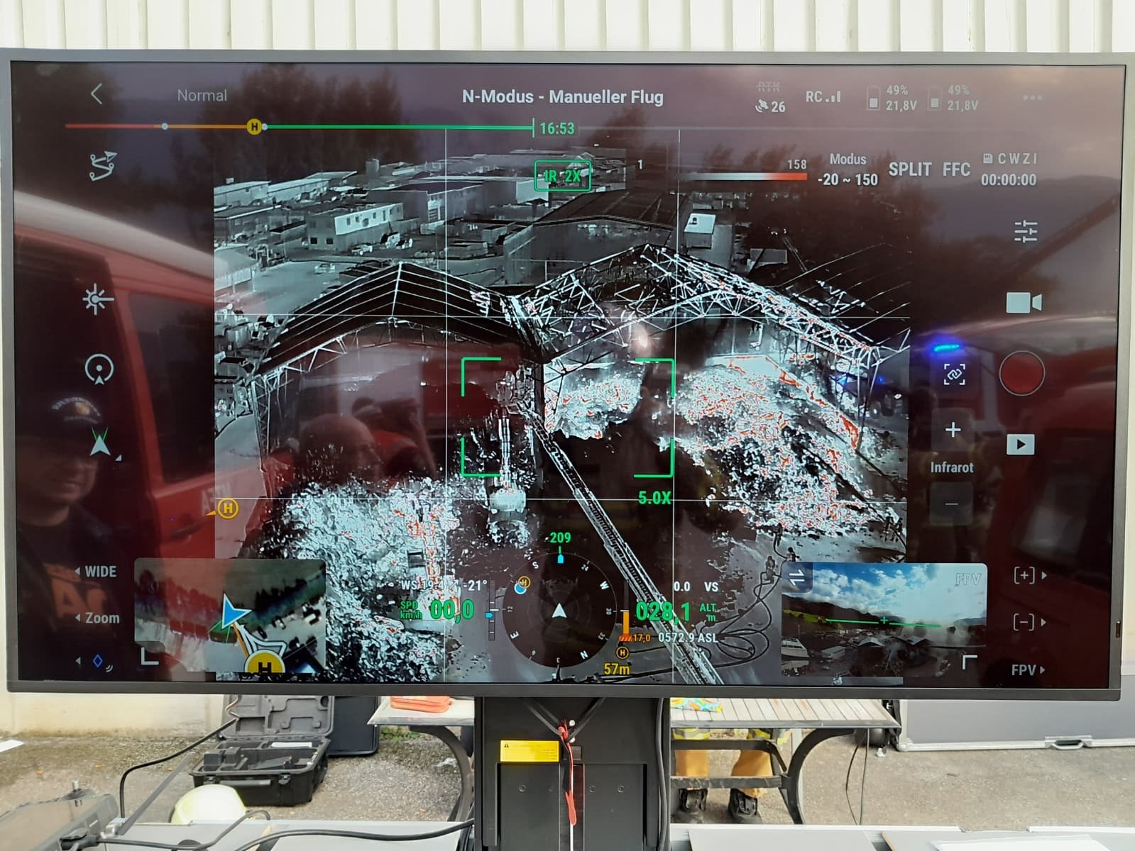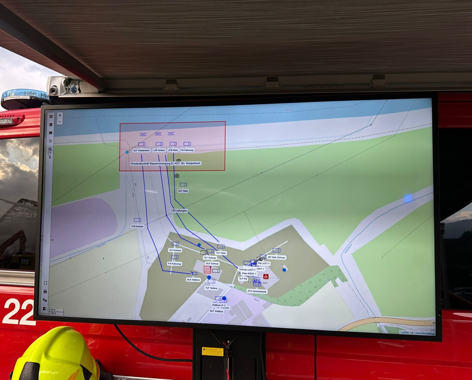 Schnell war ein passender Platz gefunden, dieser wurde eingerichtet und für den Hubschrauberbetrieb abgesichert. Zwei Flughelfer der Freiwilligen Feuerwehr Schwaz wurden direkt beim Gerätehaus Schwaz aufgenommen und führten sofort einen Erkundungsflug über das Einsatzgebiet durch.