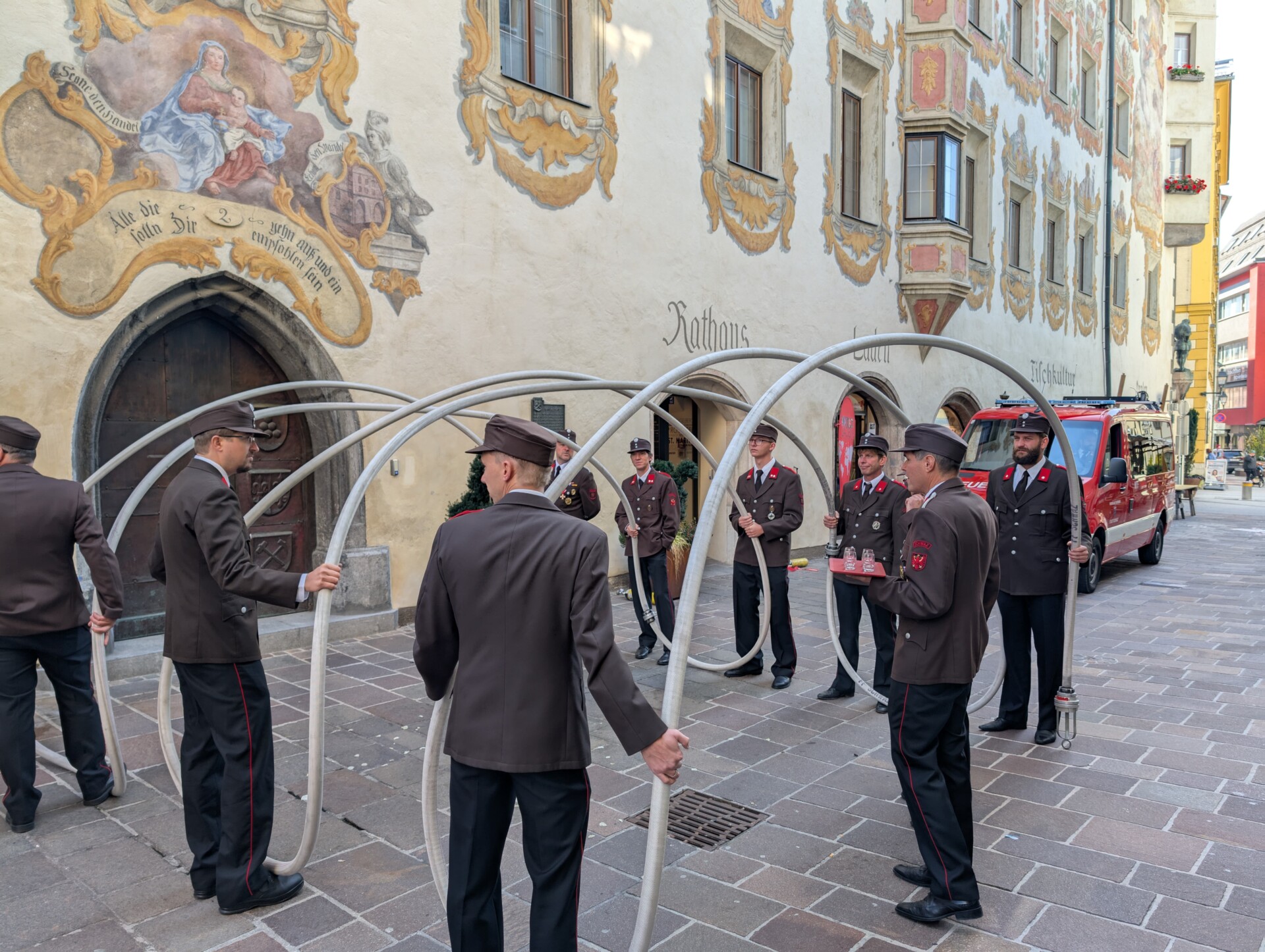 Zu diesem besonderen Anlass ließ es sich der 4. Zug natürlich nicht nehmen, ein Stück Tradition beizusteuern: Vor dem Rathaus bildeten die Kameraden eine Schlauchspalier, durch die das frisch vermählte Paar symbolisch in den neuen Lebensabschnitt einziehen durfte.
